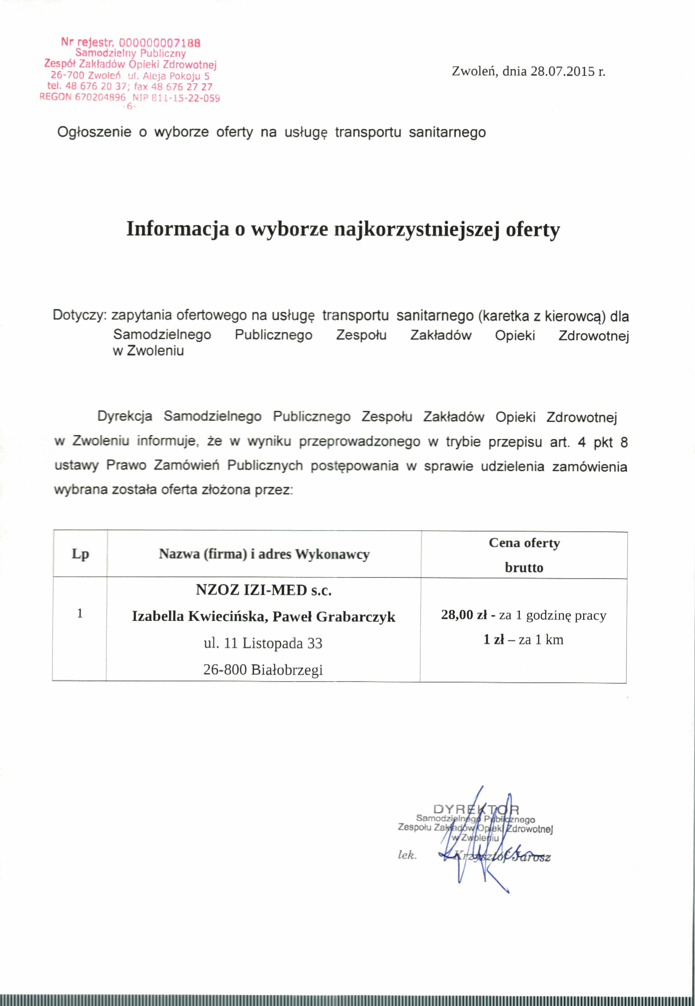 Informacja o wyborze najkorzystniejszej oferty na usługę transportu sanitarnego (karetka z kierowcą)